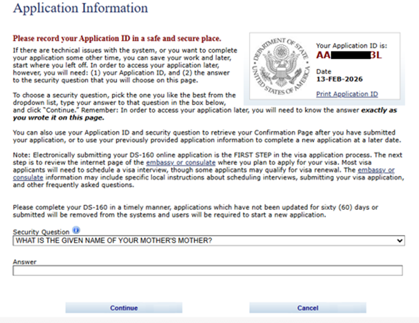 El proceso inicia en el sitio oficial del Departamento de Estado. Al comenzar, el sistema asigna un número de identificación (Application ID) que debe guardarse, ya que permite recuperar el formulario en caso de interrupción. También se solicita crear una pregunta de seguridad.