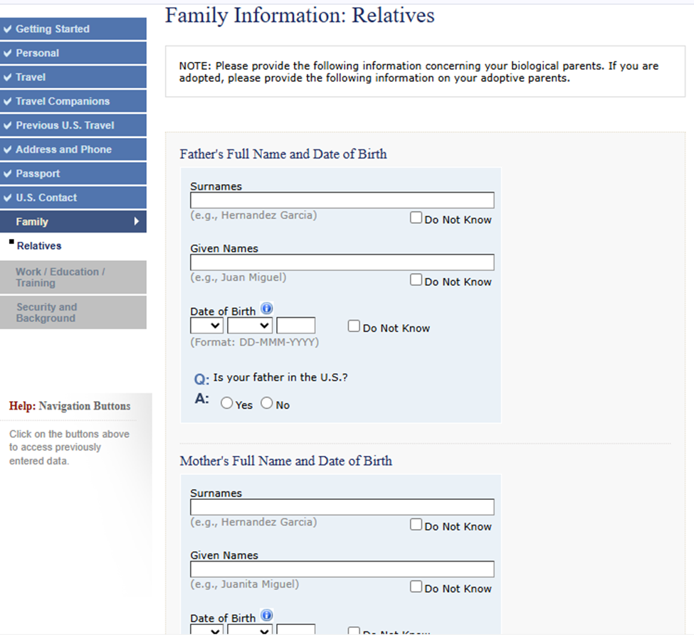 Family: Información sobre padres, cónyuge e incluso familiares que residan en EE.UU.