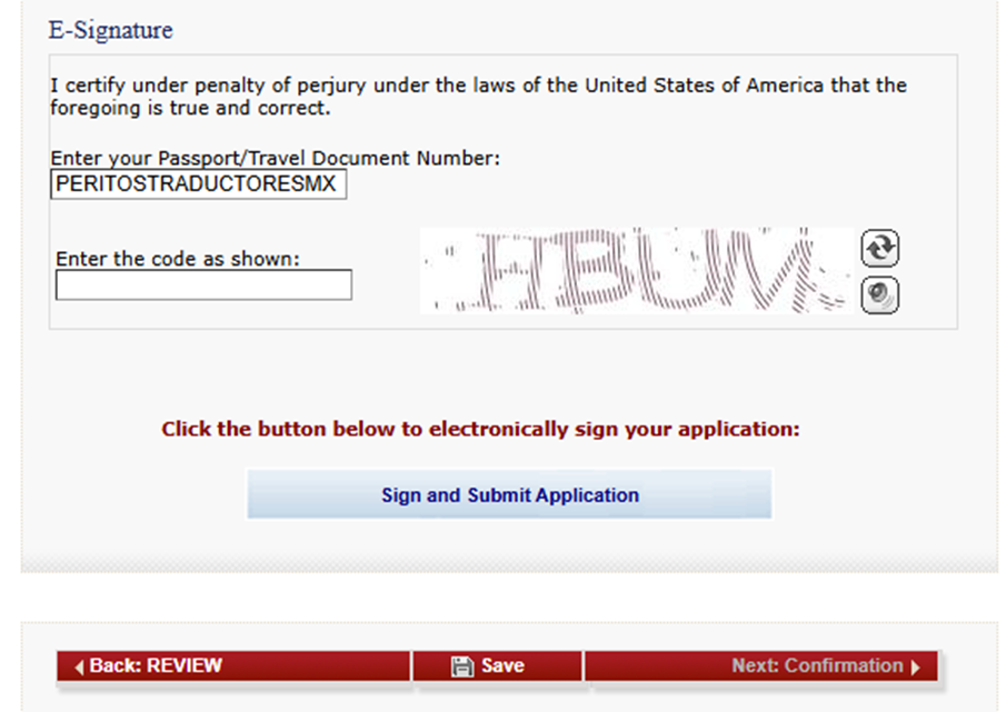 - Confirmación del formulario DS-160.