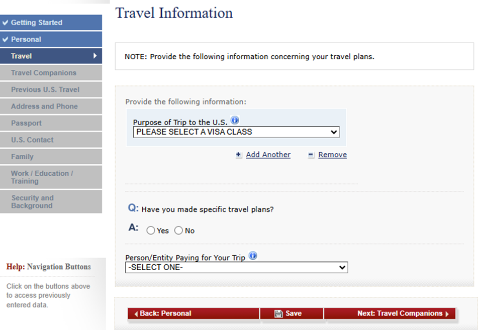Travel: Información del viaje, incluyendo propósito, tipo de visa, fechas estimadas y dirección donde se hospedará en EE.UU.