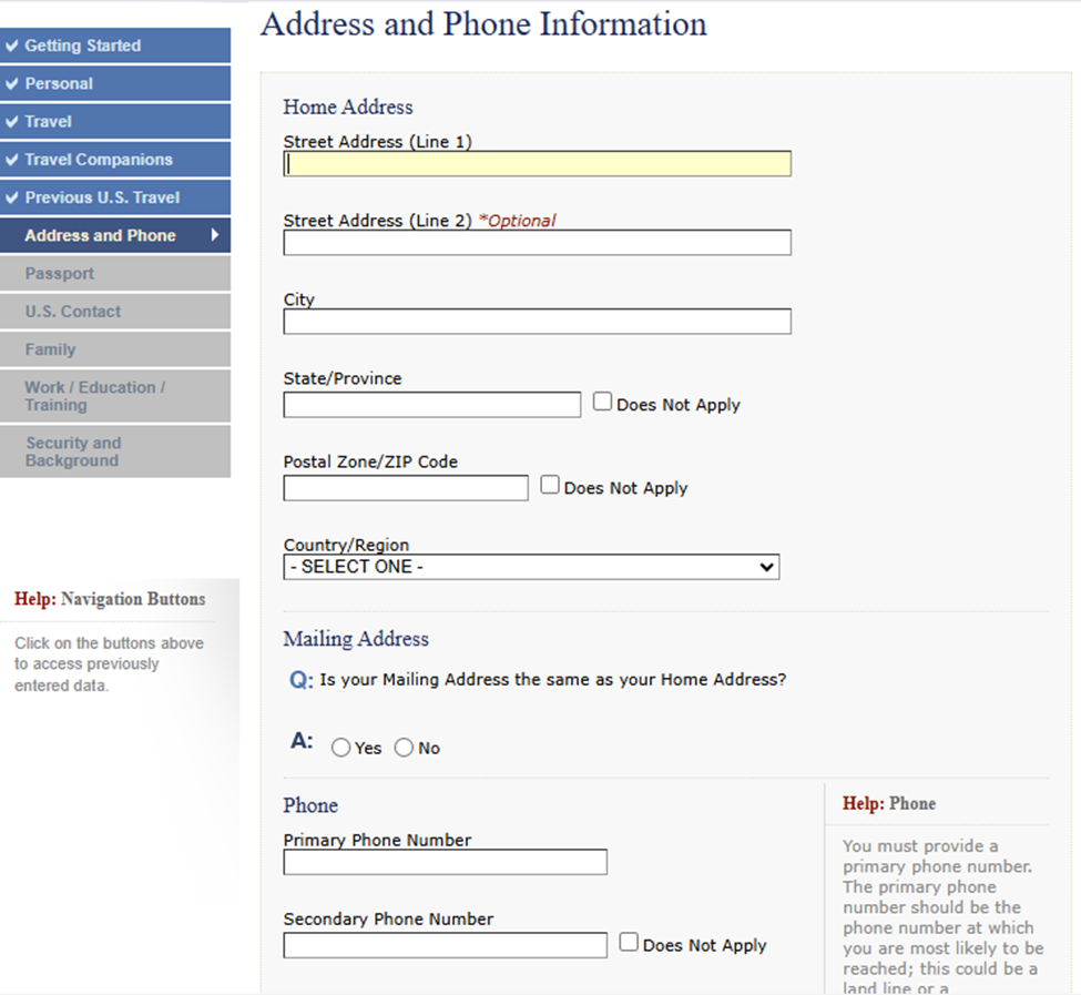 Previous U.S. Travel: Historial de viajes anteriores a Estados Unidos, incluyendo visas previas y fechas de ingreso.